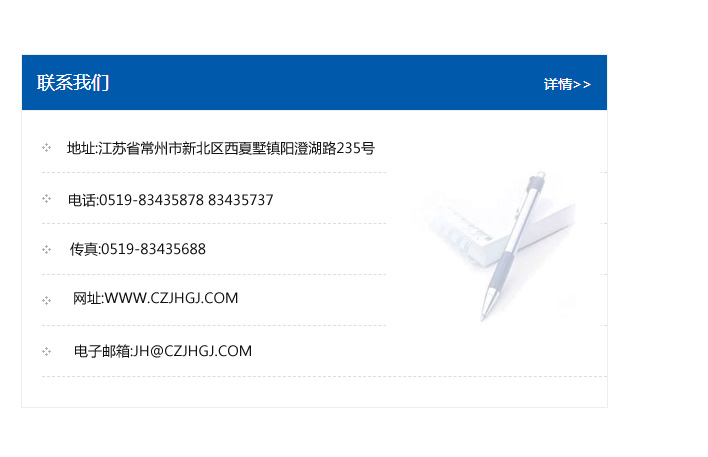 傳真:0519-83435688    郵編:213135    網址:WWW.czjhgj_com.xinhailing.com    電子郵箱:JH@czjhgj_com.xinhailing.com